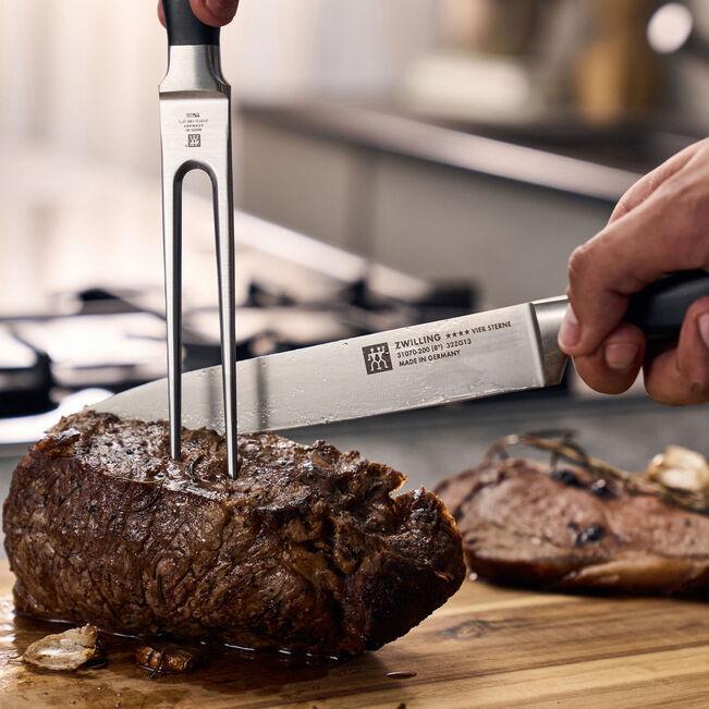 This 2-piece carving set makes serving and slicing meat effortless and easy. The slicing knife blade precisely cuts through meat while the carving fork provides stability and security while holding the meat in place. Carve roast turkey, slice baked ham, and cut filet mignon into succulent slices.