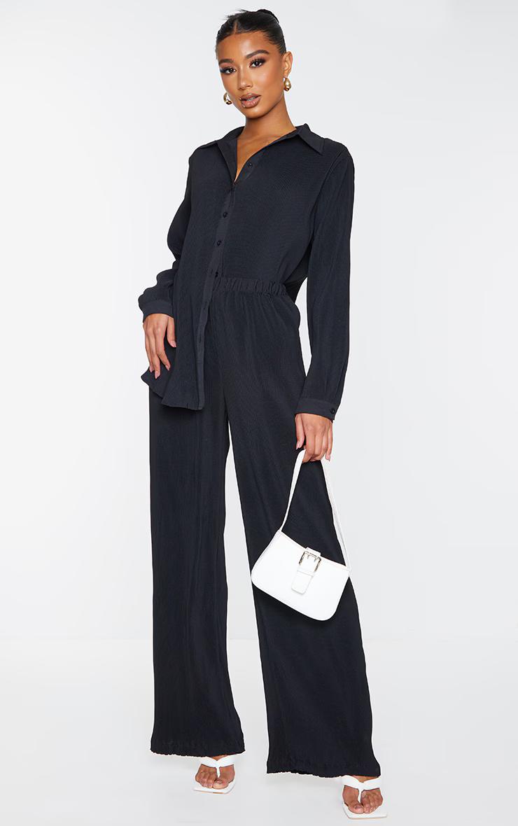 These black plisse pants offer a masterclass in texture and silhouette. Cut from a subtly shimmering plisse fabric, the high waist and wide leg create a lengthening effect that s both modern and timeless. The plisse detailing adds depth and movement, making these pants a versatile base for any considered edit. Style them with a fitted knit top and barely-there heels for a sophisticated evening look, or pair them with a crisp white shirt and statement jewelry for a cool take on workwear. For a coordinated day look, try a fitted bodysuit and a blazer, or for evening, dress up with a high-neck top and complete with a delicate chain from our jewelry collection. Length approx 80cm/31.5" (Based on a sample size UK 8) Model wears size UK 8/ EU 36/ AUS 8/ US 4 | Black Plisse High Waisted Wide Leg Pants