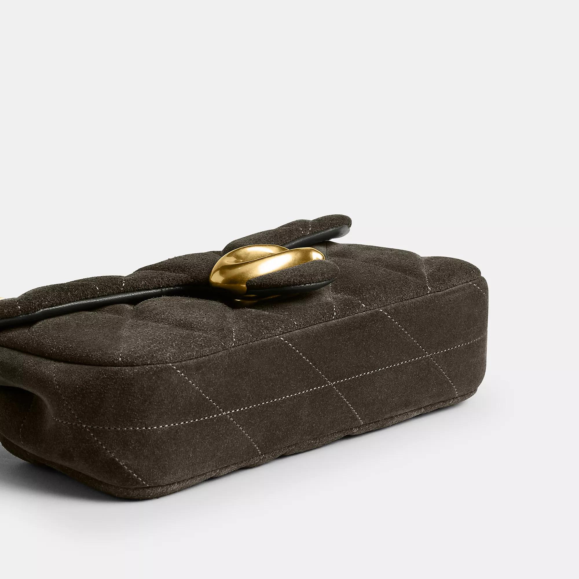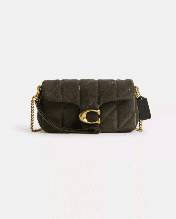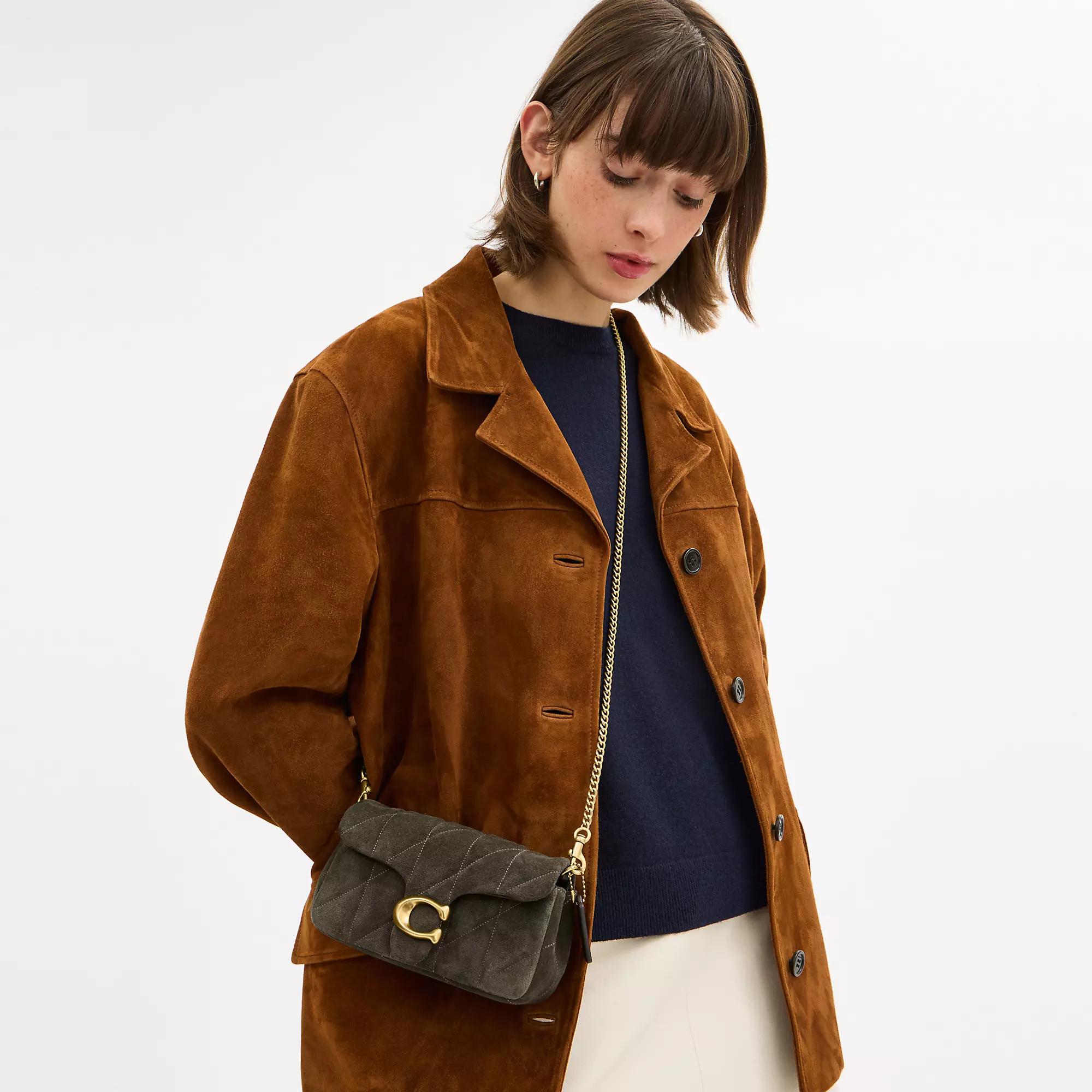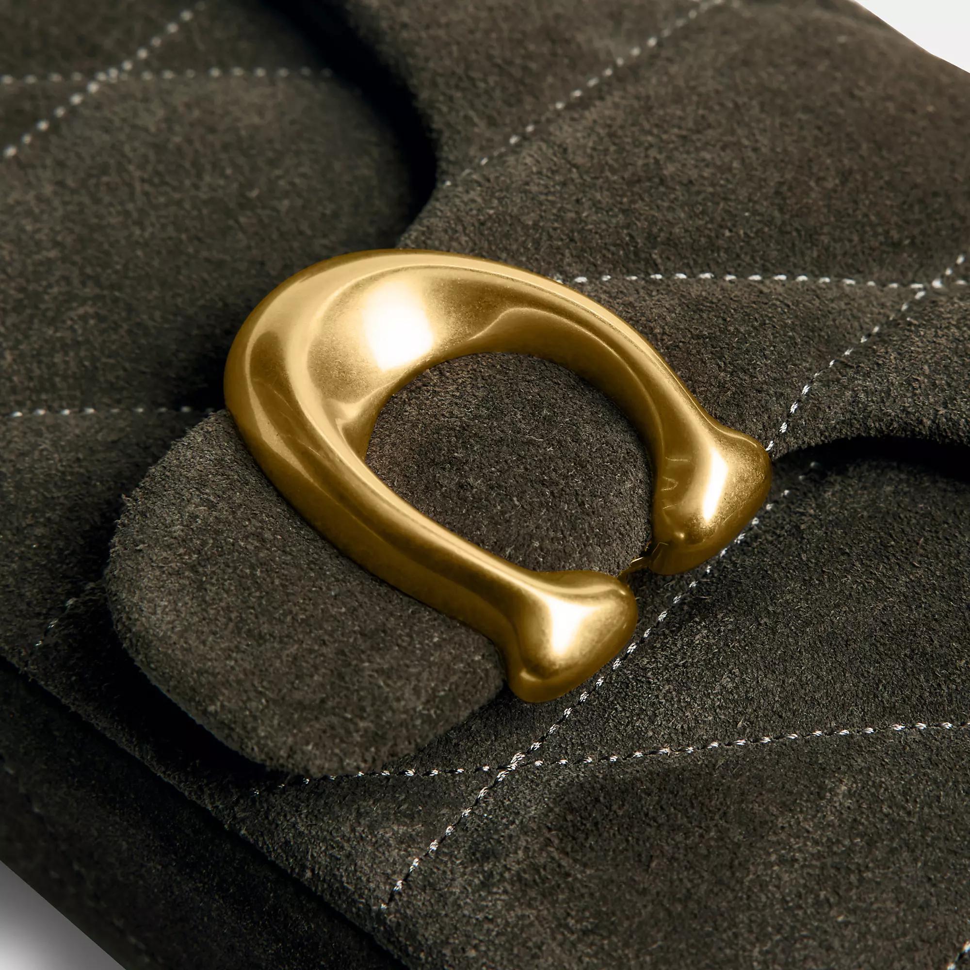 A modern take on an archival 1970s Coach design our structured Tabby Chain Crossbody Bag 19 is crafted of quilted velvety suede. Finished with our Signature hardware this organized two-compartment design is perfectly sized for cards cash and a phone with a convenient exterior slip pocket for easy access to essentials. The versatile style can be carried as a wristlet or a clutch and worn crossbody with the elegant chain strap making it the perfect choice for both dressed up and casual looks. Coach Tabby Chain Crossbody Bag 19 With Quilting - Women's - Brass/olive