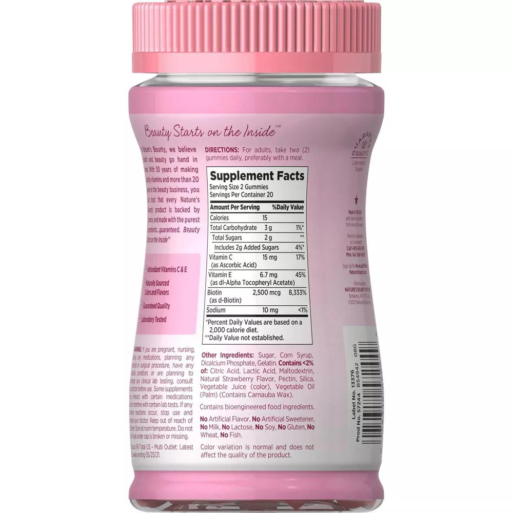 Nature's Bounty® Optimal Solutions® Hair, Skin & Nails Gummies provides you with the vital nutrients your body needs to support your natural beauty from within.* Vitamin E and Vitamin C are antioxidants. Vitamin E contributes to skin health, and Vitamin C is involved in collagen production and formation, which forms the basis for vibrant skin.* Biotin helps to maintain healthy hair.*