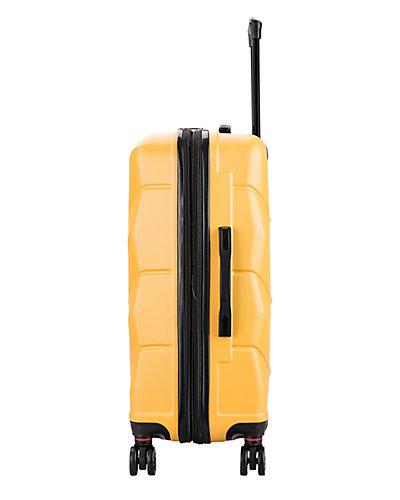 Color/material: mustard lightweight PC/ABS with micro diamond finish Exterior measures 19in wide x 12in high x 28in deep Interior measures 17.32in wide x 10.6in high x 25.2in deep Top and side ergonomic GEL handles for comfortable and easy lifting 4 dual spinner 360 silent wheels for effortless mobility Full interior fabric lining with zippered compartment on one side and snap-on straps on the opposite side for easy packing 4 side studs allows the luggage to stand upright Push Button Locking internal retractable trolley system Smooth gliding oversized zippers Suitcase expands 2'' for additional extra space Weight: 8.15 Manufacturer's 10 year limited warranty Imported