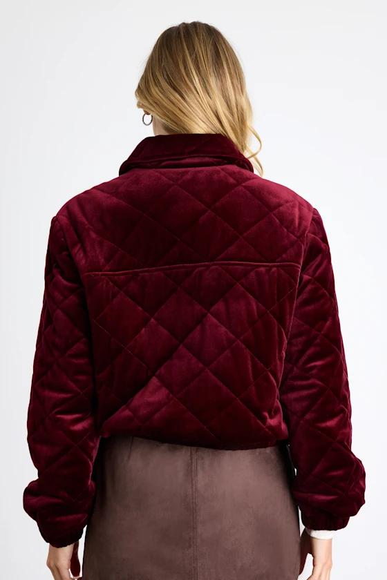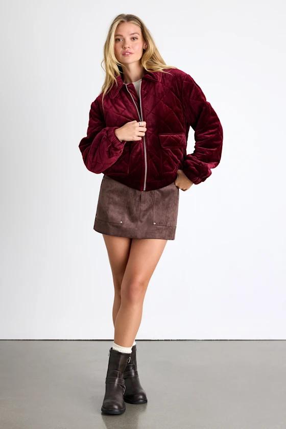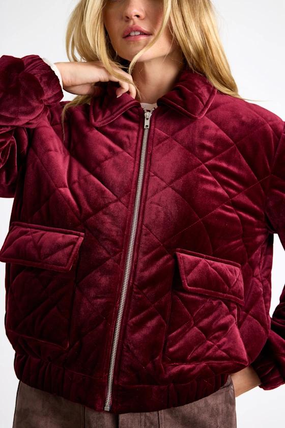 Cozy and chic all over, plush velvet crafts this fall-ready jacket that is ready for strolls through leaf-covered streets with PSLs in hand. A trendy quilted design sweeps across the bomber-style silhouette that features a classic collared neckline and a relaxed-fit bodice with a silver zipper at the front, all framed by long sleeves with elastic cuffs. Front patch pockets and an elasticized hem complete the look. Fit: This garment fits true to size. Length: Size medium measures 24" from top to bottom. Bust: Great for any cup size. Waist: Not Fitted - comfortable room throughout midsection. Undergarments: May be worn with any standard bra. Fabric: Fabric has no stretch. Lined. Shell: 95% Polyester, 5% Spandex. Lining: 97% Polyester, 3% Spandex. Hand Wash Cold. Do Not Bleach. Hang Or Line Dry. Low Iron If Needed. Imported. Lulus | Fayda Burgundy Velvet Quilted Collared Bomber Jacket | Size X-Small.