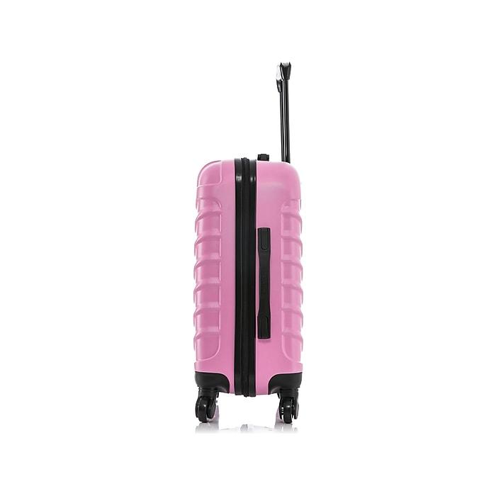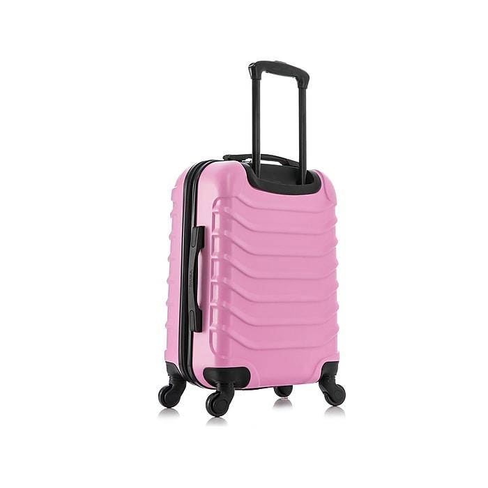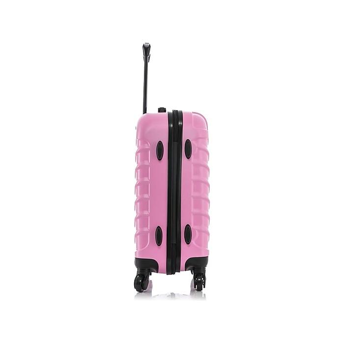 The InUSA Endurance 20" hardside spinner luggage has a retractable trolley system, four spinner wheels, and ergonomic handles for comfortable transportation. The interior is fully lined and includes zippered compartments and elastic cross straps, while the luggage can stand upright. Interior Measurements: 13. 77"W x 8. 66"D x 20"H. Exterior Measurements: 14. 56"W x 8. 46"D x 21. 45"H. Made of lightweight PC/ABS material with a micro diamond textured finish; comes in pink. Features a push-button locking internal retractable trolley system. Four side studs allow the luggage to stand upright on its side. Hard-flex construction offers maximum strength, durability, and a water-/scratch-resistant finish. Offers a contemporary, impact-resistant, functional design. Top and side ergonomic gel handles for comfortable and easy lifting. Four spinner multi-directional silent 360-degree wheels for effortless mobility. Includes full 210D polyester interior lining and tie-down straps to secure your belongings. Features smooth-gliding self-repairable oversize zippers. Suitable for major airlines. Comes in a carry-on size; weight: 5. 51 lbs. 10-year manufacturer limited warranty (requires online registration). ⚠ WARNING: California Proposition 65 Warning. This product can expose you to chemicals including lead, which are known to the State of California to cause cancer and birth defects or other reproductive harm. For more information go to www. P65Warnings. ca. gov Safety Data Sheet