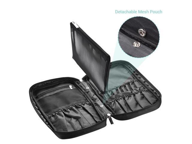 Large capacity: 17 Slots and several pockets to store all kinds of brushes and other items such as eye shadow, eyeliner, foundation and more Detachable Mesh Pouch: Removable mesh bag in the center, you can take it out to use it as an independent little makeup bag Durable & Water-resistant: Made of 190D polyester & PVC for durability and water-resistance; washable for easy cleaning