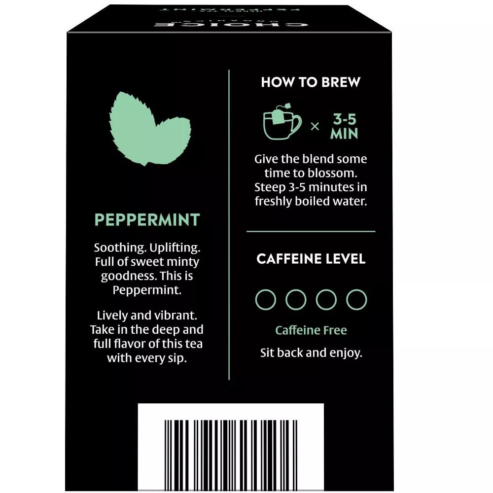 Choice Organics Tea Peppermint is a soothing and uplifting herbal tea. Naturally caffeine free, this highly aromatic tea is silky soft with a rich, creamy center and cooling finish. Wonderfully refreshing when served hot or as a crisp iced tea, our Peppermint tea makes for the perfect sip any time of the day. Our tea bags are expertly blended with premium USDA certified organic peppermint leaves intentionally sourced from our neighboring state of Washington — pure Pacific Northwest peppermint. Choice Organics' bold, flavorful teas are sustainably sourced from around the world for a delicious cup every time. Give the blend some time to blossom. Steep 5 minutes in freshly boiled water.