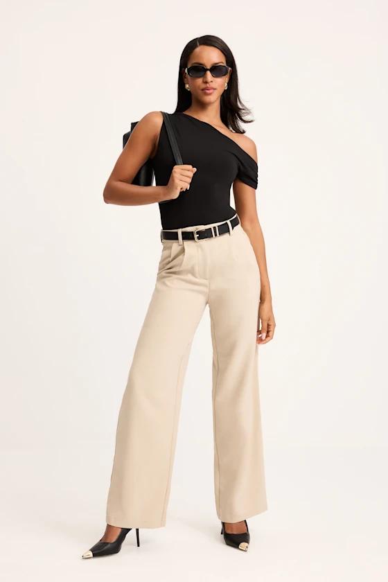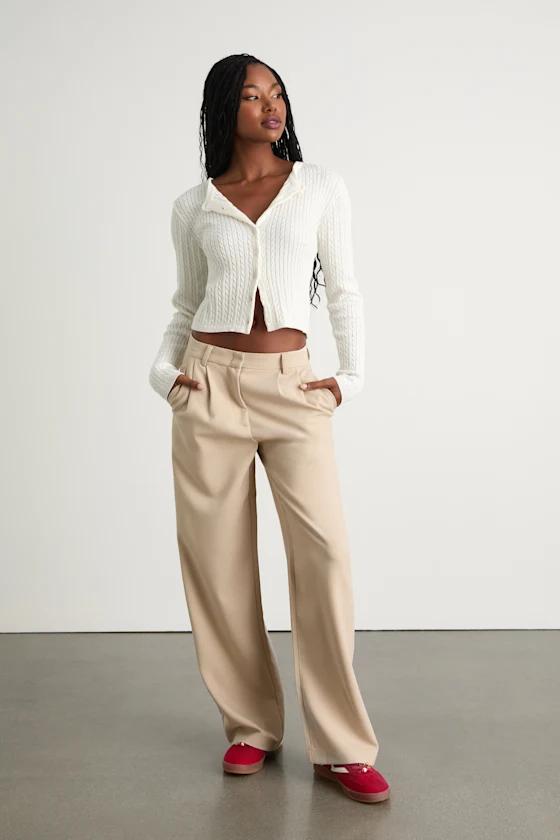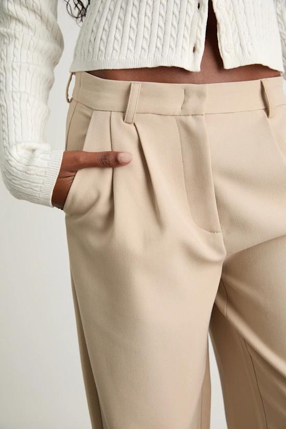 Specifically tailored for literally all your style needs These trousers are exclusive and essential, designed to be the most reliable piece in your wardrobe. Sleek woven fabric offers effortless wear as it shapes a mid-rise waist and wide, full-length pant legs that perfectly drape. Along with classic details like pleating, belt loops, and a functional zip fly that are just a must, a partially elasticized waistband ensures a comfortable fit every time. Length: Size 8 Inseam: 31.00 Front Rise: 12.50 Lined pockets. Shell: 81% Polyester, 16% Rayon, 3% Spandex. Pocket Lining: 100% Polyester. Hand Wash Cold. Do Not Bleach. Hang Or Line Dry. Low Iron If Needed. Imported. Lulus | Cleo Beige Tailored Wide-Leg Trousers | Size 8 | 100% Polyester.