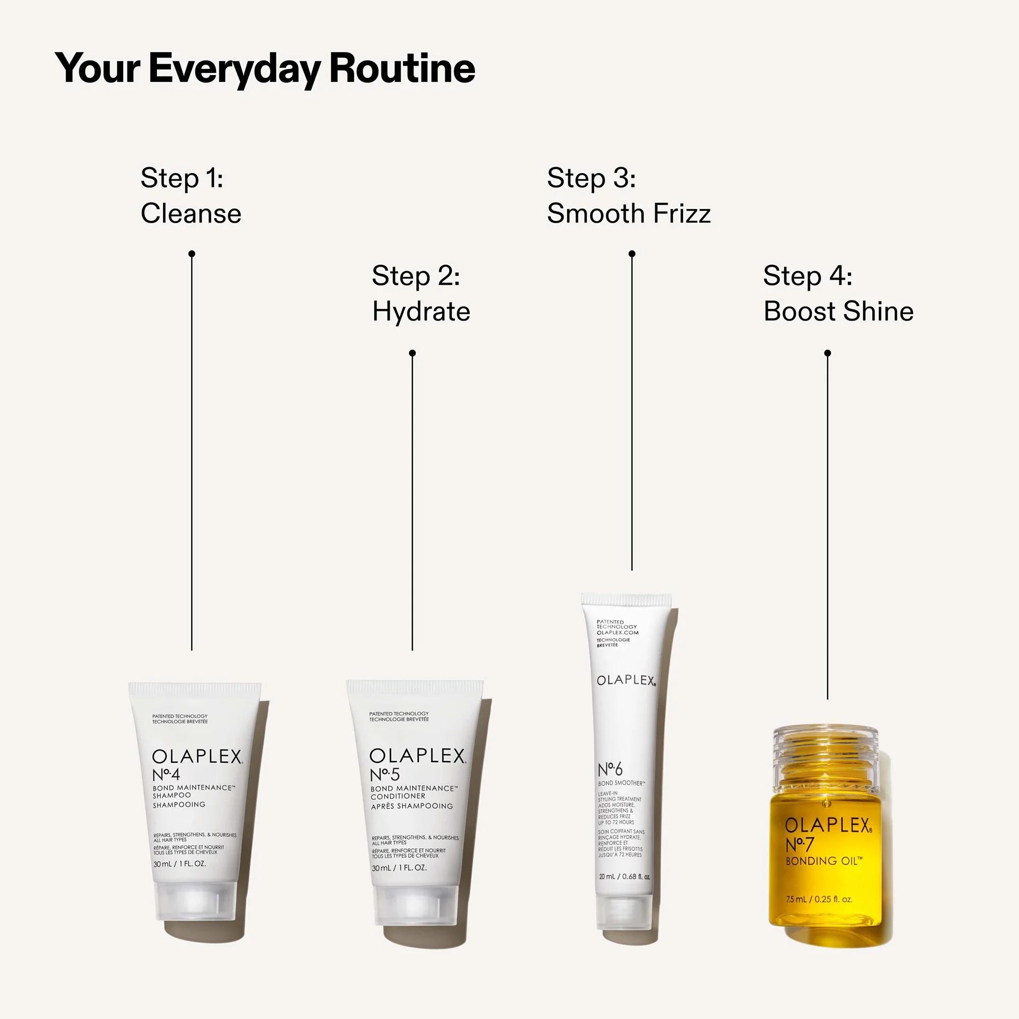 Uniting five bestselling formulas from Olaplex, the limited-edition Strong Start Hair Kit equips you with everything you need to encourage smooth, visibly fortified lengths. Suitable for all hair types, the travel-friendly set is powered by Olaplex’s signature bond technology, working to minimise the risk of breakage.Set Contents:No.3 Hair Perfector 30mlThis treatment restores softness and visible shine to damaged hair. Designed to be used before shampoo, the formula encourages silky results.No.4 Bond Maintenance Shampoo 30mlCleanse and nourish the lengths with this hydrating formula. The shampoo lifts impurities from the hair and diminishes the look of split ends.No.5 Bond Maintenance Conditioner 30mlLightweight and detangling, this conditioner lessens the appearance of damage and promotes a radiant appearance.No.6 Bond Smoother 20mlA leave-in treatment that visibly minimises frizz and flyaways to encourage a sleek finish. Suitable for use on wet or dry hair, the styling cream leaves strands feeling stronger.No.7 Bonding Oil 7.5mlElevate your styling routine with this multi-purpose hair oil. The moisturising formula transforms the appearance of dullness with a lustrous shine, all while delivering heat protection up to 232°C.