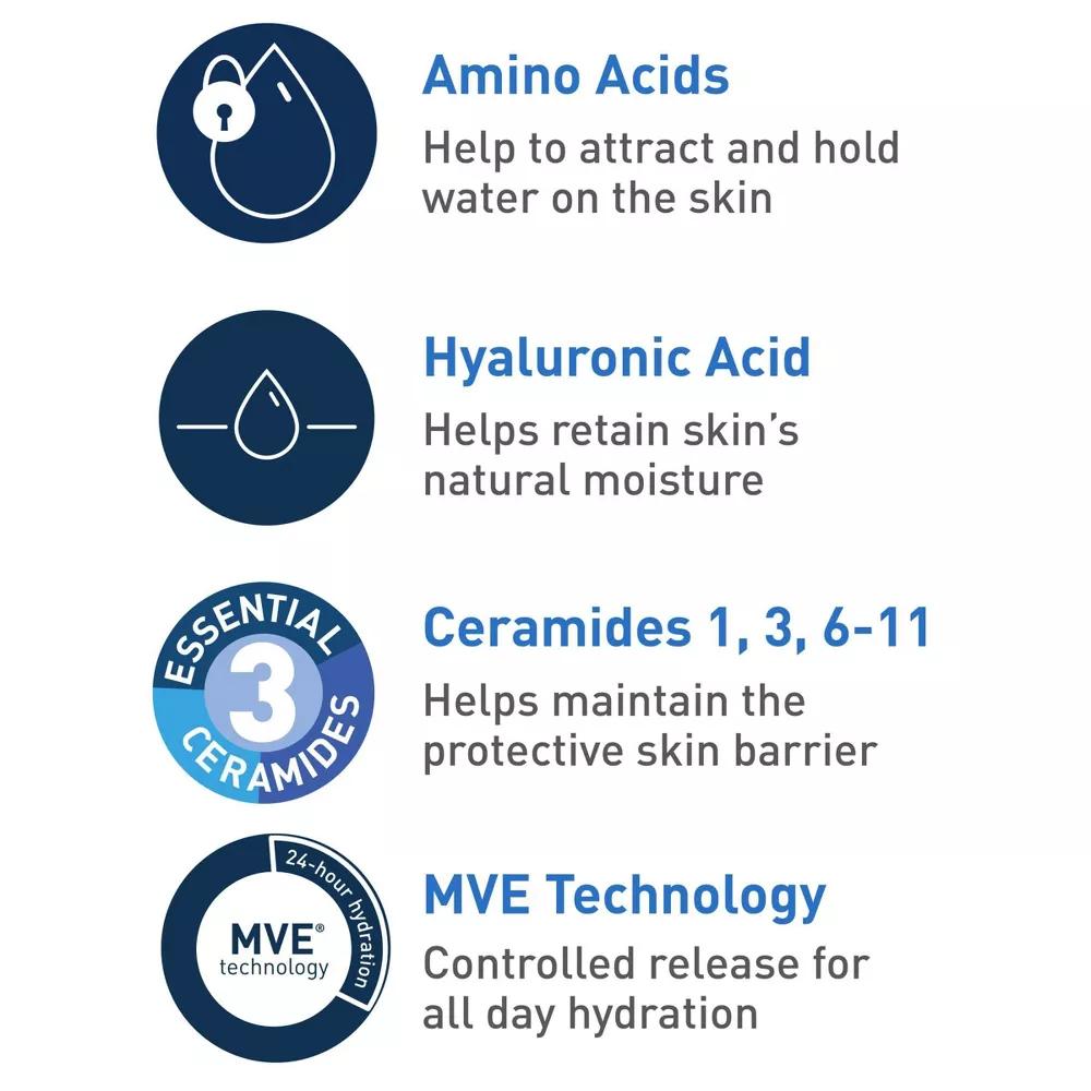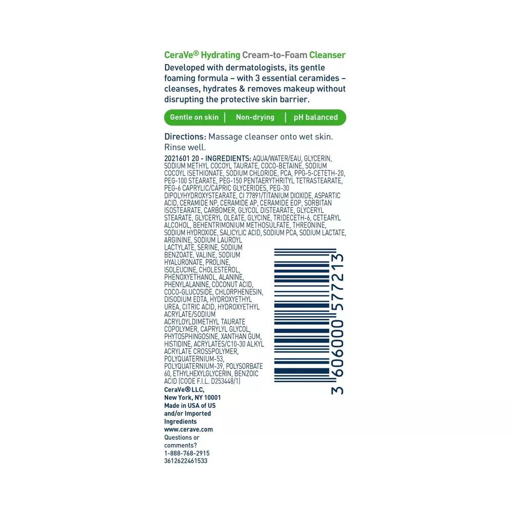 Developed with dermatologists, CeraVe Hydrating Cream-to-Foam Face Cleanser is a one-step face wash for daily facial cleansing, face and eye makeup removal, and long-lasting hydration. Gently removes dirt, excess oil, and even long-wear foundation and daily SPF sunscreen residue. Cleanser for face dispenses as a rich cream and transforms into a foam as you lather into skin. Non-drying formula thoroughly cleanses without stripping skin of moisture or leaving a tight, dry feeling. Suitable for normal to dry skin. Fragrance free, paraben-free, soap-free, non-comedogenic, and pH balanced. Can be used as a face wash, body wash and/or hand soap. Unisex. Suitable for all skin types, contact lens wearers, adults and young adults (12+). Consumer Results: • 100% of users* agree that it instantly removes dirt, oil, pollution and facial makeup • 98% of users* agree that this cleanser efficiently yet gently and effortlessly cleanses their skin • 98% of users* agree that this cleanser is pleasant to use, with a delicate, gentle foam • More than 98%* of users find their skin clean, smooth, soft, refreshed, and healthy without feeling stripped • More than 98%*of users love this cleanser after 2 weeks of daily use Our new CeraVe bottles, contain the same Developed with Dermatologists formulas you know and love and the same amount. The bottles are now made with LESS plastic and 100% Recycled plastic (excluding the pump). The 8oz and 12oz bottle sizes contain 17% and 21% less plastic compared to the current bottles, respectively. Key Ingredients: • Amino acids help attract and hold water on the skin • Ceramides help restore and maintain the skin's natural barrier • Hyaluronic acid attracts hydration to the skin's surface and helps dry skin retain moisture • MVE Technology encapsulates ceramides to ensure efficient delivery within the skin’s barrier and slow release over time, supporting your protective skin barrier long after you’ve finish applying. How to use: Wet face with lukewarm water. Rub cleanser in your hands until you get a dense foam, then massage into face and eye area in a gentle, circular motions. Rinse well. Avoid direct contact with eyes. If contact occurs, rinse thoroughly with water. *Consumer study *Packaging contains recycled content - CeraVe's Hydrating Cream-to-Foam Cleanser 8oz and 12oz bottles are made from 100% post-consumer recycled content (PCR) excluding the pump.