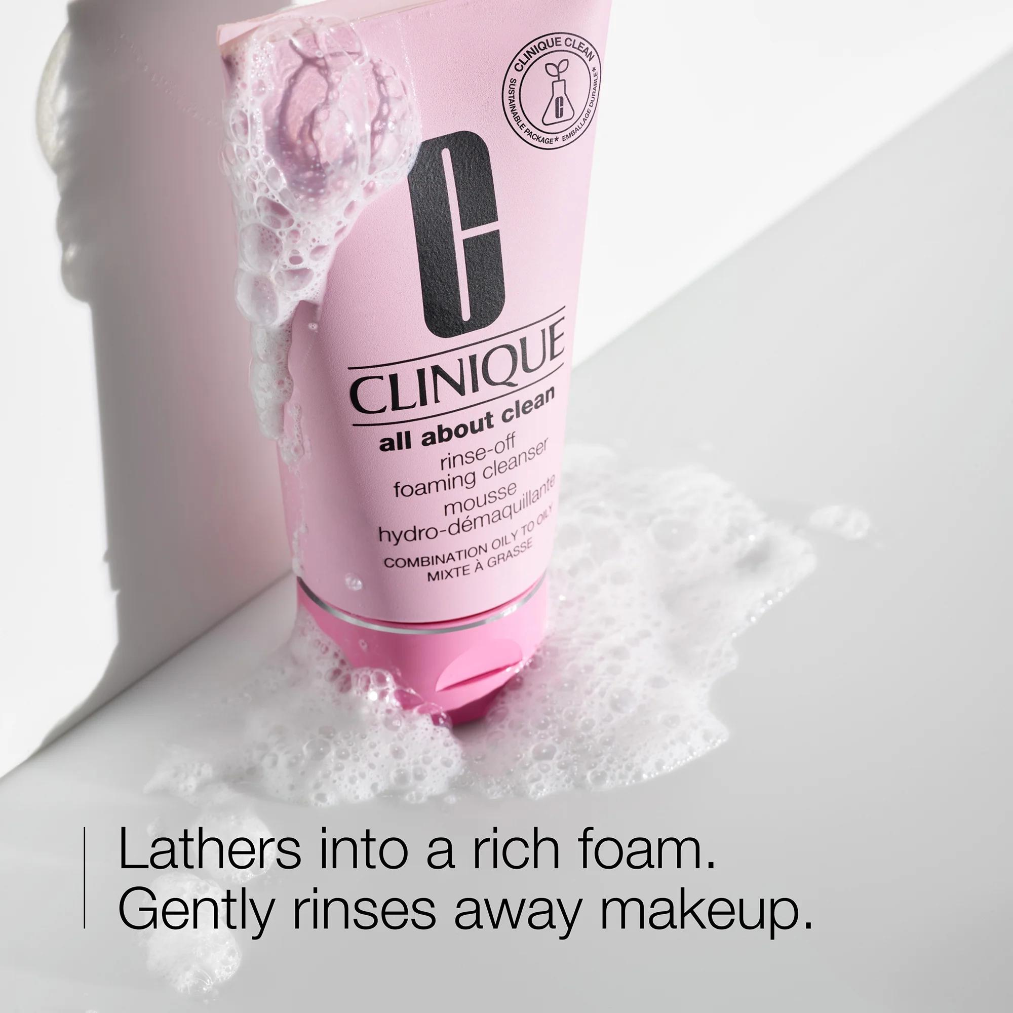 Experience a refreshing cleanse with Clinique's Rinse-Off Foaming Cleanser, a gentle yet thorough formula that works to wash away dirt and impurities. Enriched with soothing chamomile, the concentrated cleanser works into a luxurious foam on the skin, removing long-wearing makeup and sunscreen quickly and effectively, whilst leaving the skin feeling fresh, clean and moisturised. Ophthalmologist tested.