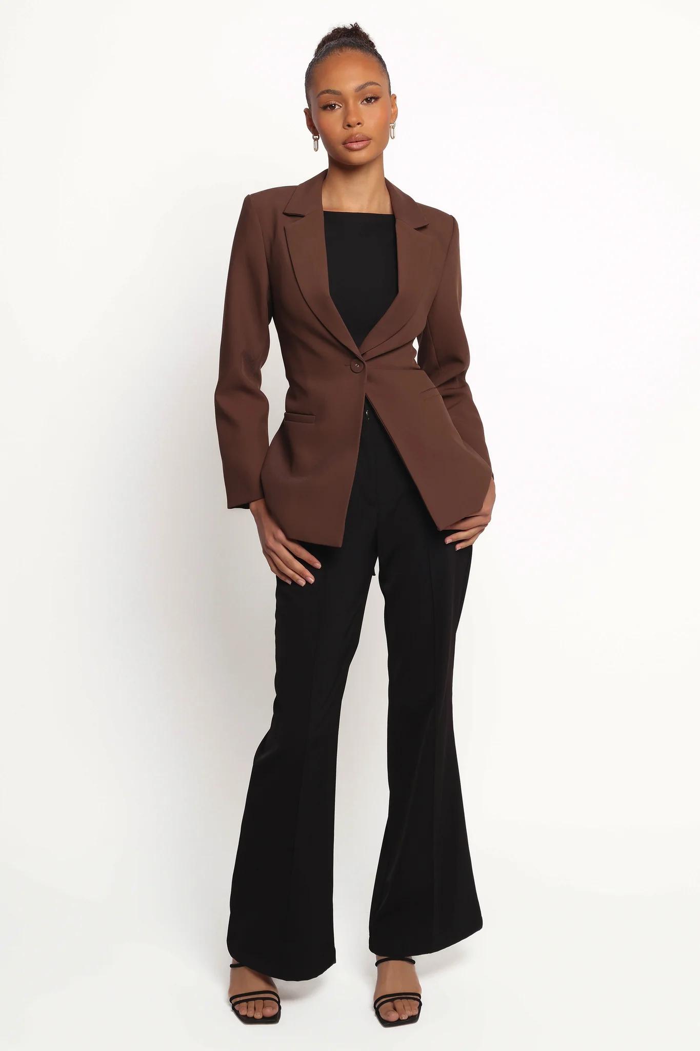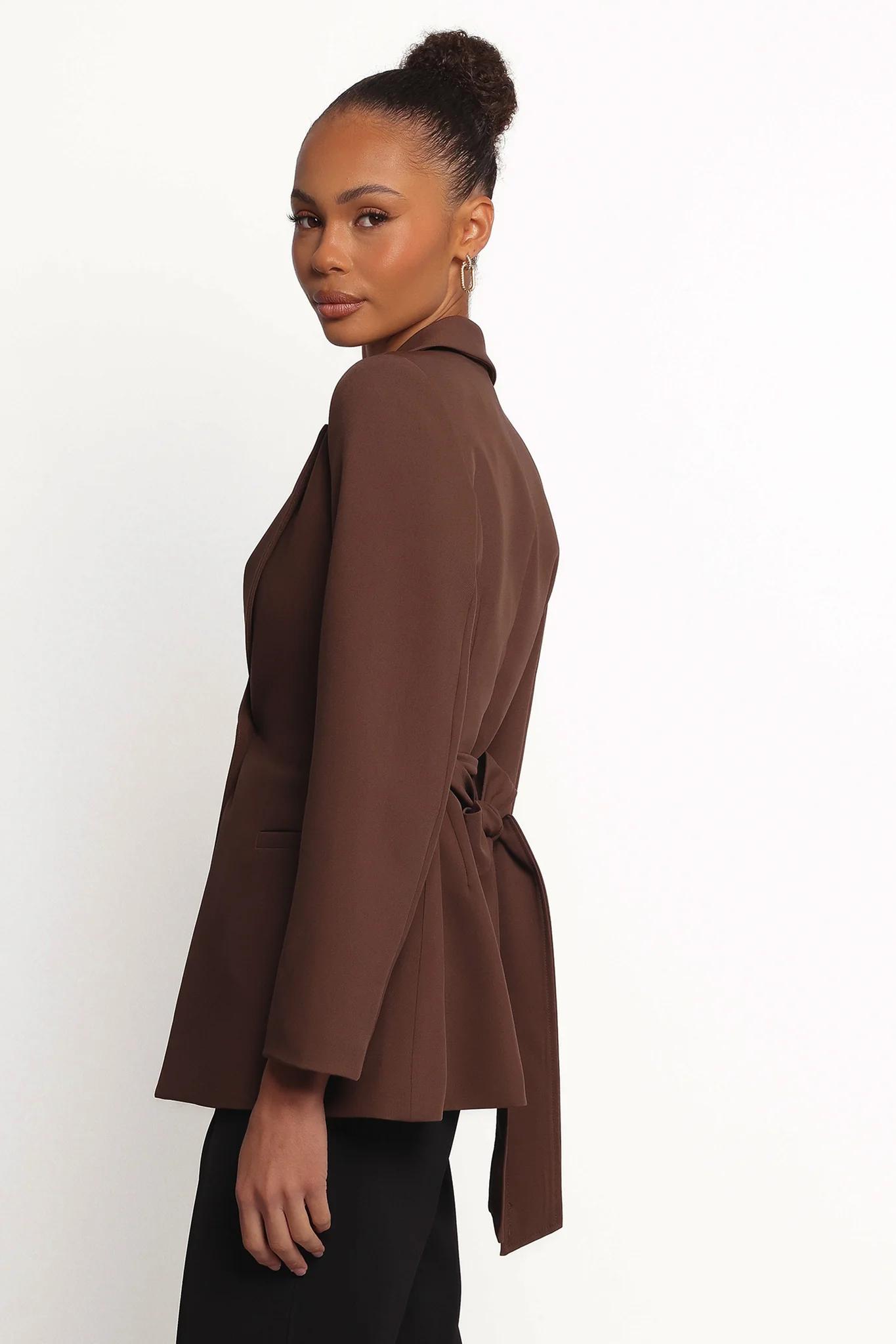 Add instant sophistication to your wardrobe with the Eliana Waist Tie Blazer in rich espresso. Designed to elevate any outfit, this blazer features a timeless spread collar with sharp notch lapels and an open front with a single button closure for effortless elegance. spread collar with notch lapels open front with single button closure long sleeves non functional pockets belt loops with detachable waist tie lined - 100% polyester