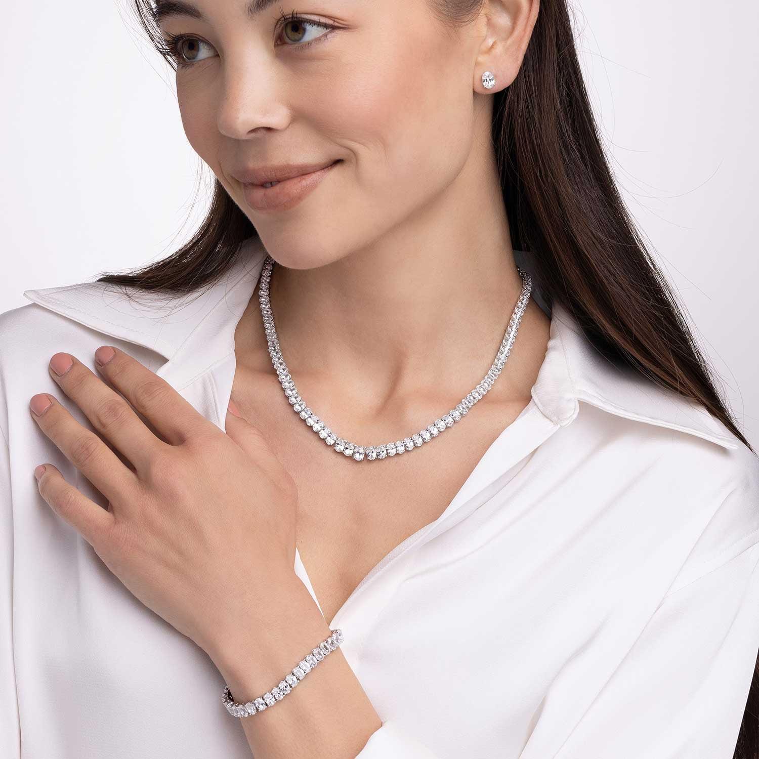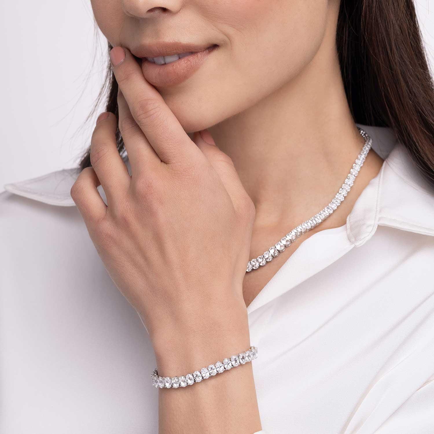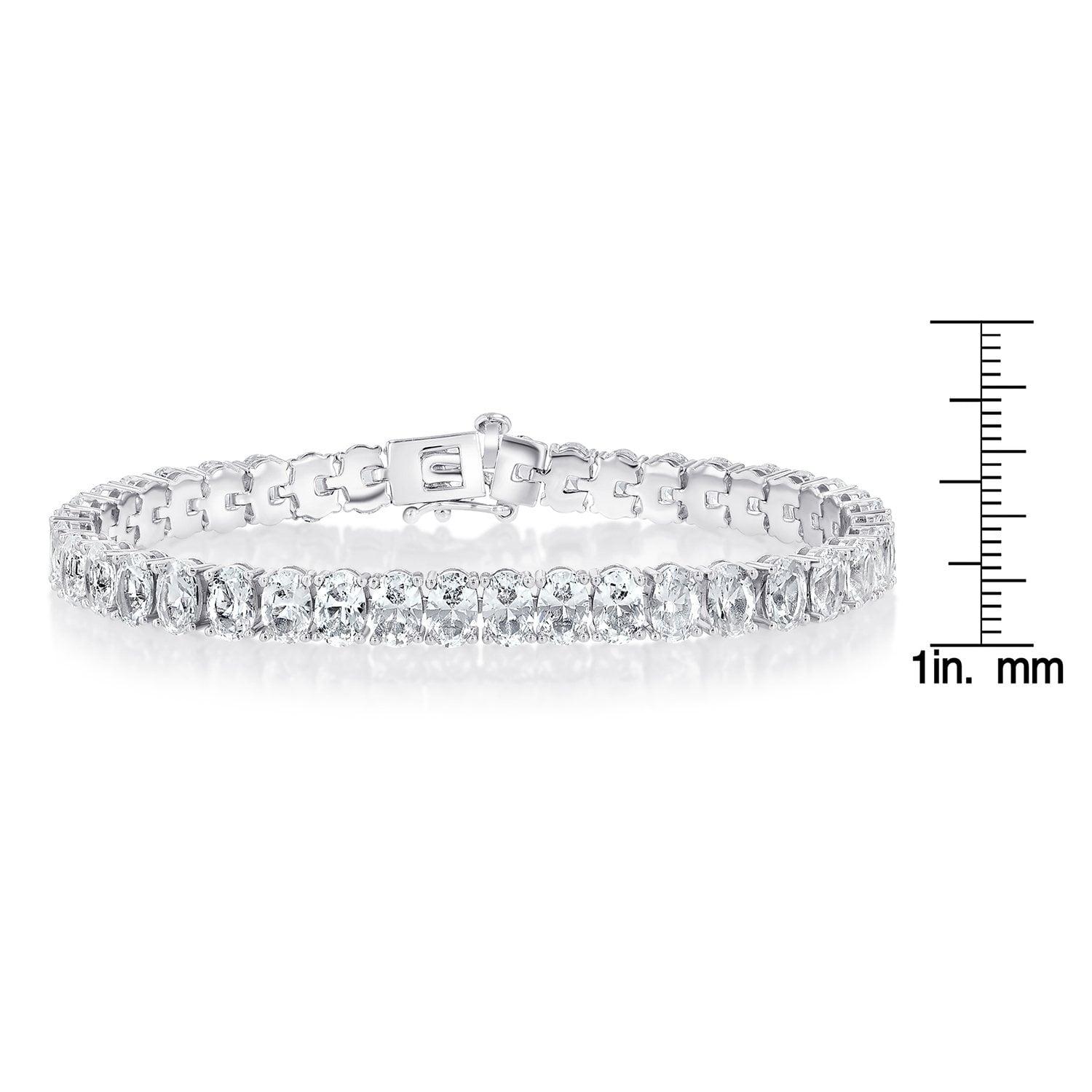 Adorn your wrist with this timelessly elegant tennis bracelet, beautifully crafted from premium 925 sterling silver. Highlighting a striking arrangement of 38 to 44 (depending on size) luminous oval-cut lab-created white sapphires, totaling an impressive average weight of 16.40 carats, this bracelet offers unparalleled sparkle and refined charm. Each stone is expertly faceted and set in a traditional four-prong setting, enhancing their natural brilliance and ensuring maximum light reflection from every angle. The bracelet's luxurious sterling silver construction is further elevated with radiant rhodium plating, providing an enduring shine and resistance to tarnish. This bracelet gracefully encircles the wrist, making it perfect for everyday elegance or special occasions. Available in 6.5, 7.0 and 7.5 inch length, this bracelet comfortably fits most wrists. A secure insert clasp provides both convenience and peace of mind, ensuring the bracelet stays securely in place during any activity. Perfect as an exceptional gift or a cherished addition to your own jewelry collection, this lab-created white sapphire tennis bracelet radiates sophistication, classic beauty, and timeless appeal.