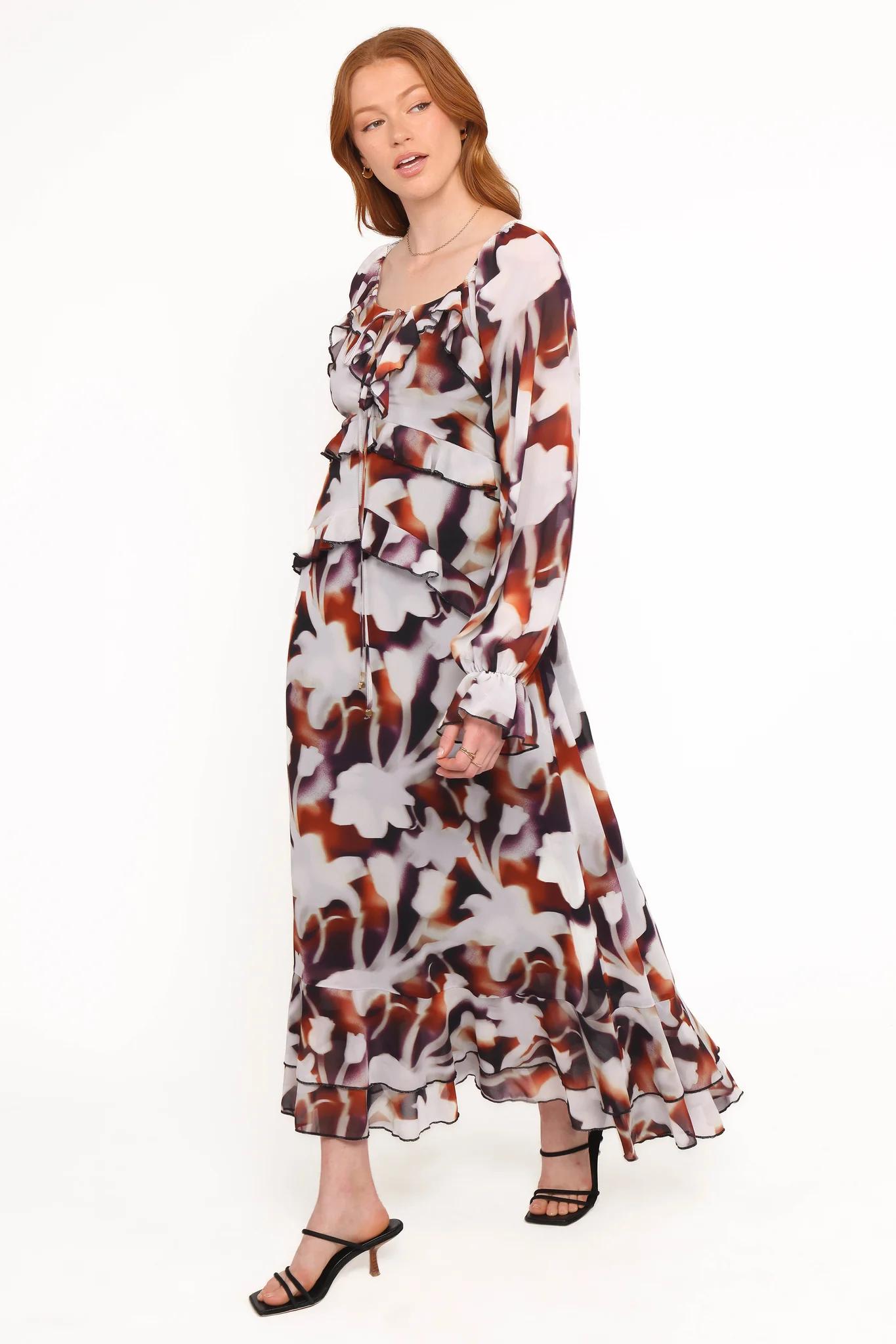 Embrace effortless elegance with the Kasey Maxi Dress in Blurred Floral, your new go-to piece for making a statement without trying too hard. This stunning floor-length dress features a flattering elasticised V-neckline with long sleeves that create a beautifully relaxed silhouette. maxi length elasticised v neckline long sleeves with elasticised cuffs cut out on bust with tie close ruffle detail belt loops with removable waist tie blurred floral print lined - 100% rayon