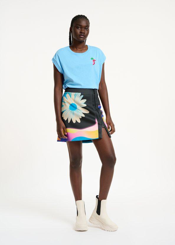 Mini skirt is cut from a heavyweight fabric with a subtle sheen that is printed with vibrant swirls and a flower on the front against a deep black background. The design is detailed with a ribbon-traced zipper, leave it partly unzipped to accentuate th