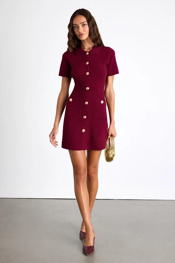 Casually put together an impressive OOTD with the Lulus Posh Outcome Wine Red Short Sleeve Sweater Mini Dress! Soft and stretchy sweater knit shapes this chic dress with a collared neckline framed by short sleeves. Shiny, embossed gold buttons create a decorative button placket that runs along the center of the fit-and-flare silhouette. Matching buttons secure patch pockets that accent the front of the A-line mini skirt. Fit: This garment fits true to size. Length: Mid-thigh. Size medium measures 33" from shoulder to hem. Bust: Great for any cup size. Waist: Fitted - stretchy fabric allows custom fit. Hip: Loosely Fitted. Undergarments: May be worn with any standard bra. Fabric: Fabric is very stretchy. Unlined. 50% Viscose, 28% Polyester, 22% Nylon. Hand Wash Cold. Do Not Bleach. Hang Or Line Dry. Low Iron If Needed. Imported. Lulus | Posh Outcome Wine Red Short Sleeve Sweater Mini Dress | Size XX-Small.