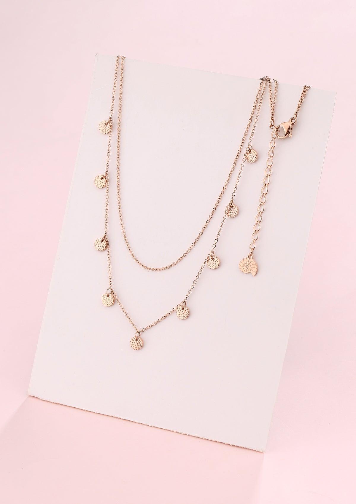This is a multi-strand layered set consisting of two rose gold-plated stainless steel necklaces: a double-stranded, fine chain necklace with nine small, round textured pendants on the longer, lower chain; and a single strand snake chain with a flat, rectangular pendant hanging from the center front of it. Both items close at the center back with a lobster claw clasp and feature an extension chain (with hanging seashell charm at the end) which allow the fit to be customizable. Delicate, romantic and effortlessly stylish, this combo will suit both formal and casual outfits.