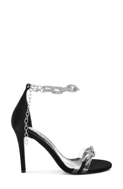 Step into elegance with this ultra-chic stiletto sandal framed by oval chain vamp straps adorned with sparkling rhinestones. A stiletto spike heel finishes this special-occasion style guaranteed to steal the spotlight. 4 1/2" heel Adjustable ankle strap with buckle closure Metal, PVC and fabric upper/synthetic lining and sole Imported