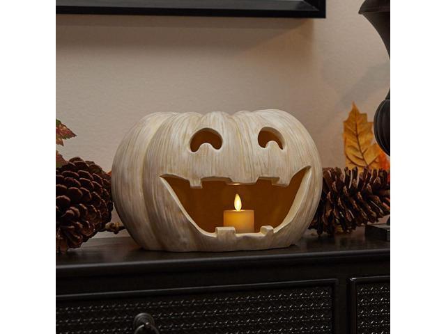 Enjoy the radiating glow of Jack-o'-lanterns this Halloween without the pumpkin seeds and slimy mess of carving. Made of premium quality resin materials, our Resin Pumpkin Tealight Holders are sturdy enough to light up your home or cast a friendly glow to trick-or-treaters. Available in both perfectly pale and ghastly sage colors, the Resin Pumpkin Tealight Holders will bring a cheerful illumination this Halloween. Luminara Perfectly Pale Jack-o'-Lantern Pumpkin Tealight Holder is made of Resin, very Sturdy and Smooth.Holder Only - Tealights Sold Separately Packaged in sturdy boxes to protect them during the shipping process. They also are easy to wrap without having to search for just the right-shaped box. They make excellent presents for any occasion-Harvest, Thanksgiving, Birthdays, Mother's Day, party hostess gifts, or even for yourself!