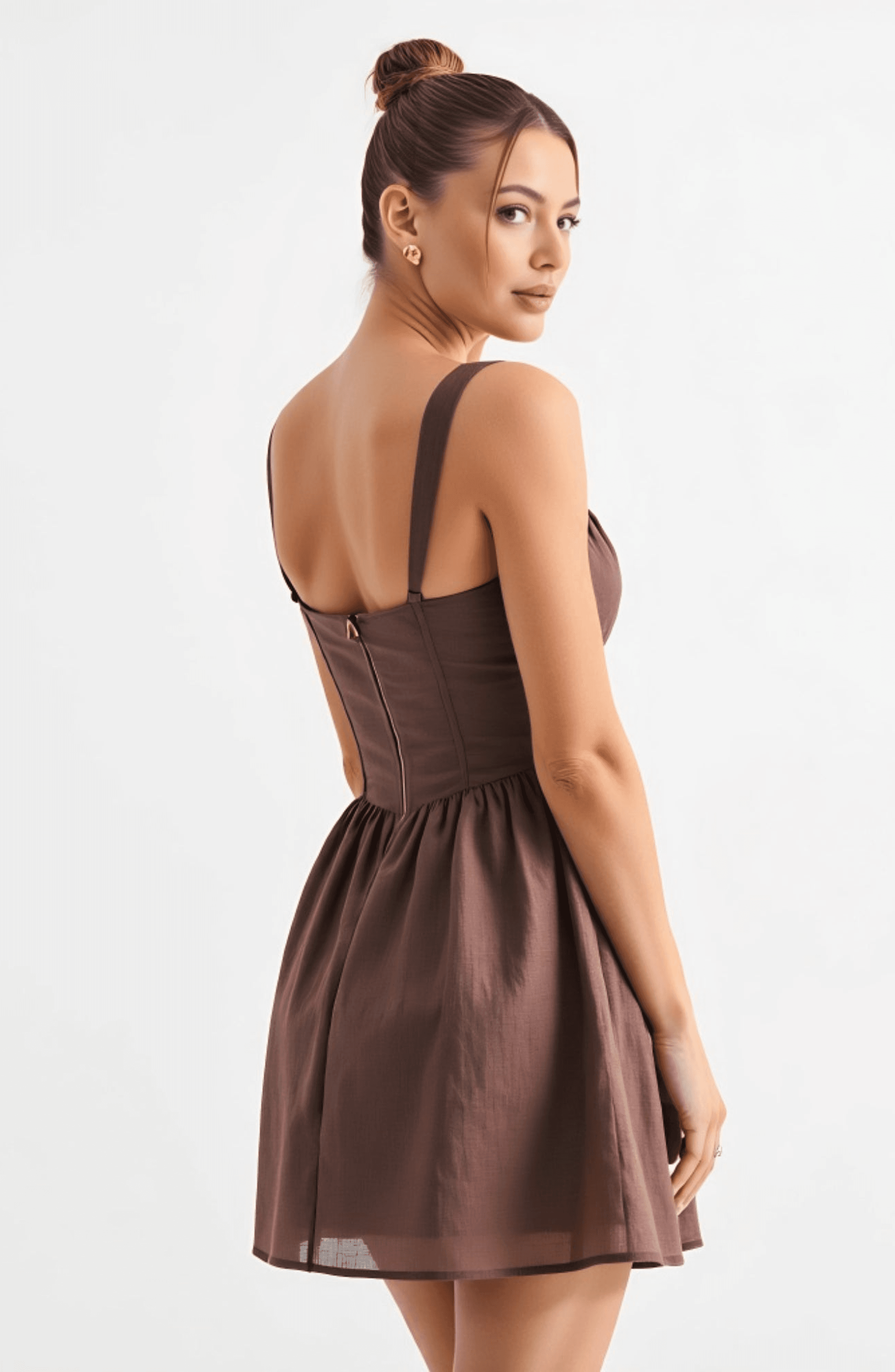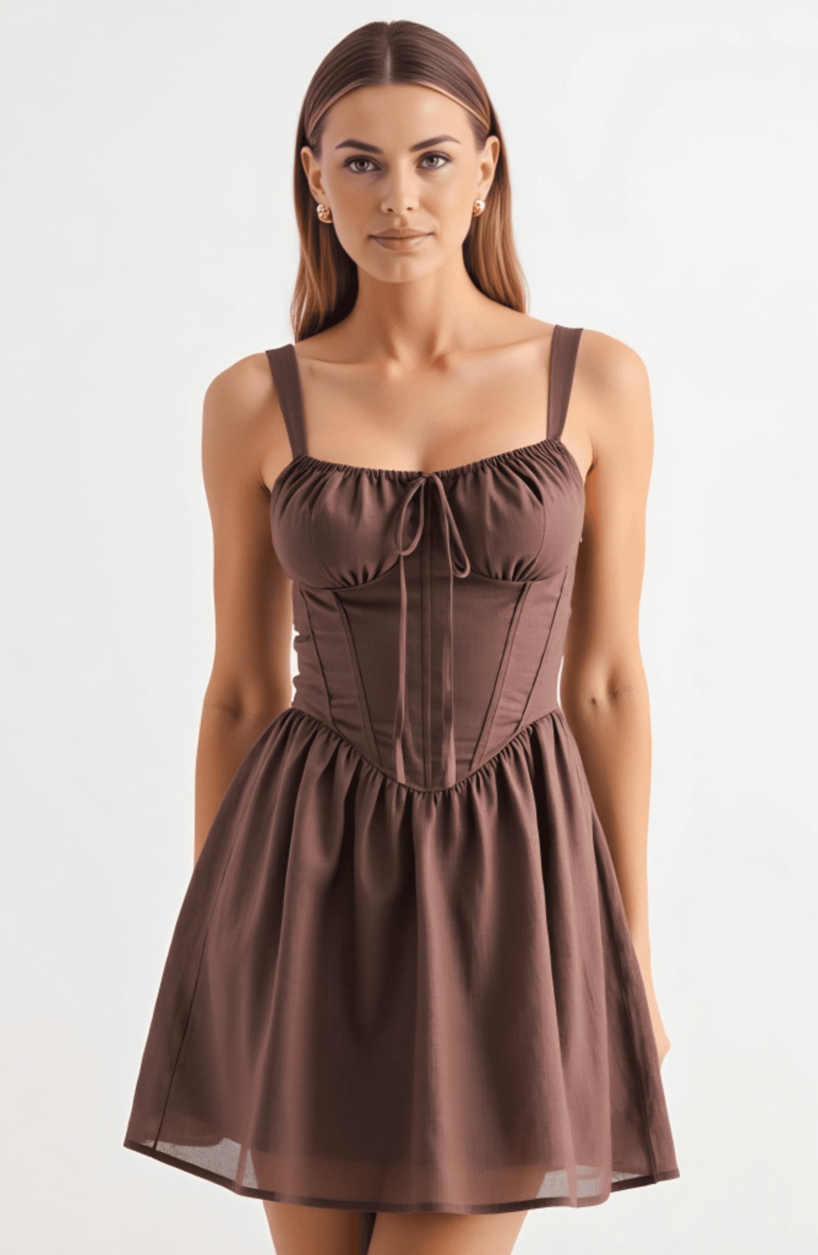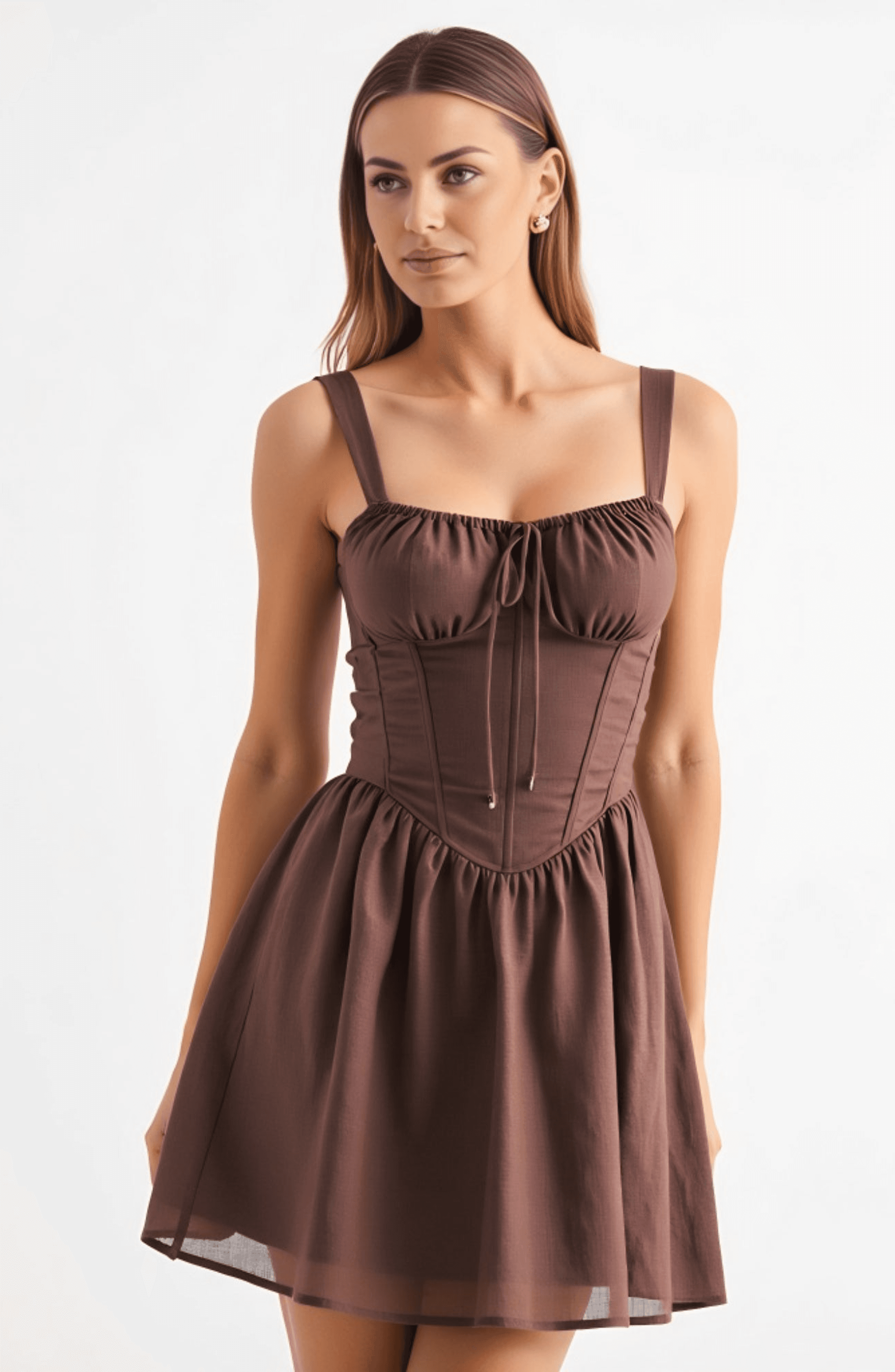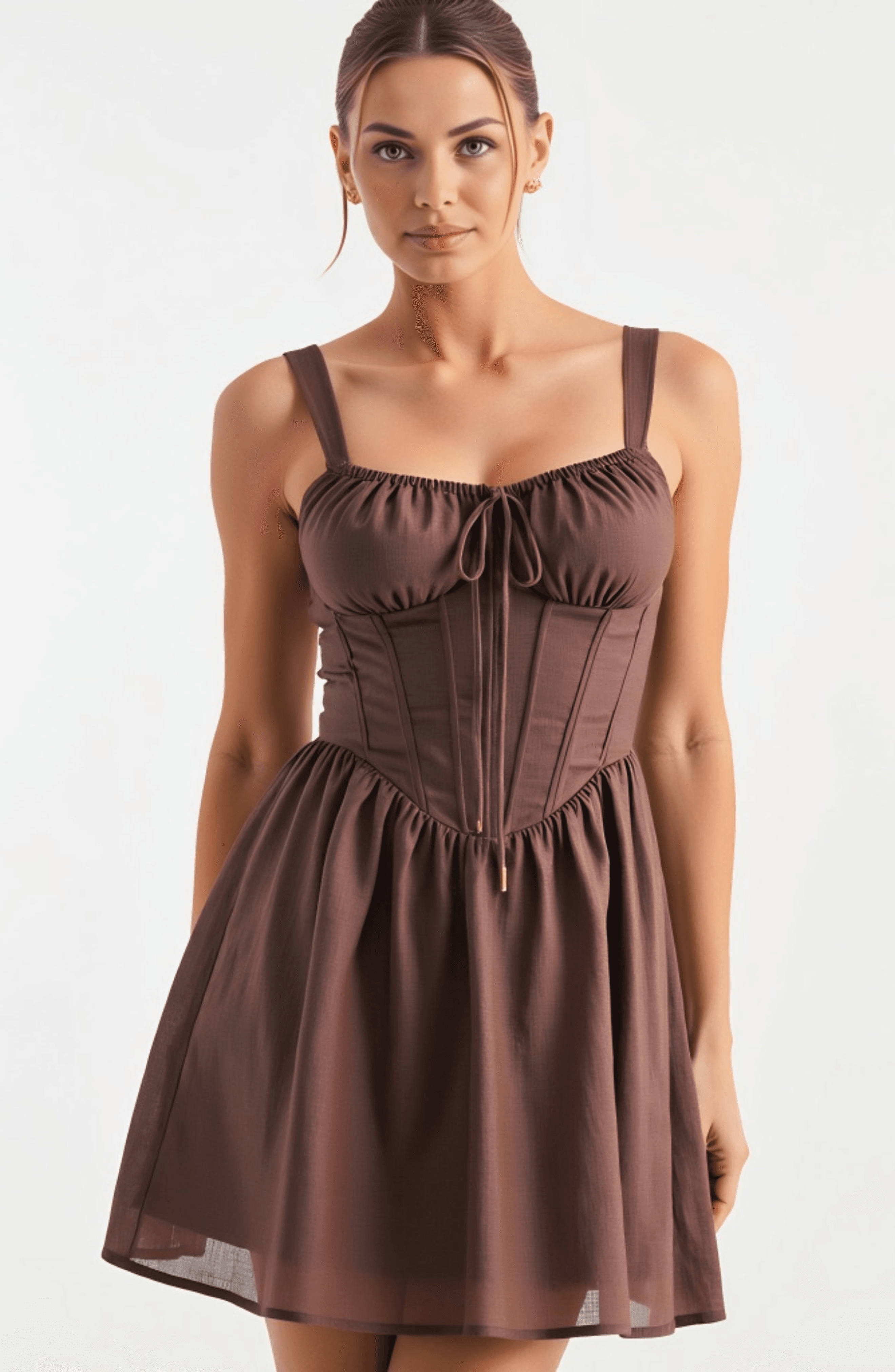This charming mini dress features a sweetheart neckline with gathered bust and adjustable tie detail, enhancing the feminine silhouette. The corset-inspired bodice is structured to define the waist, flowing into a flared, airy mini-length skirt for playful movement. Wide straps offer support and comfort, making it perfect for brunches, date nights, or parties.