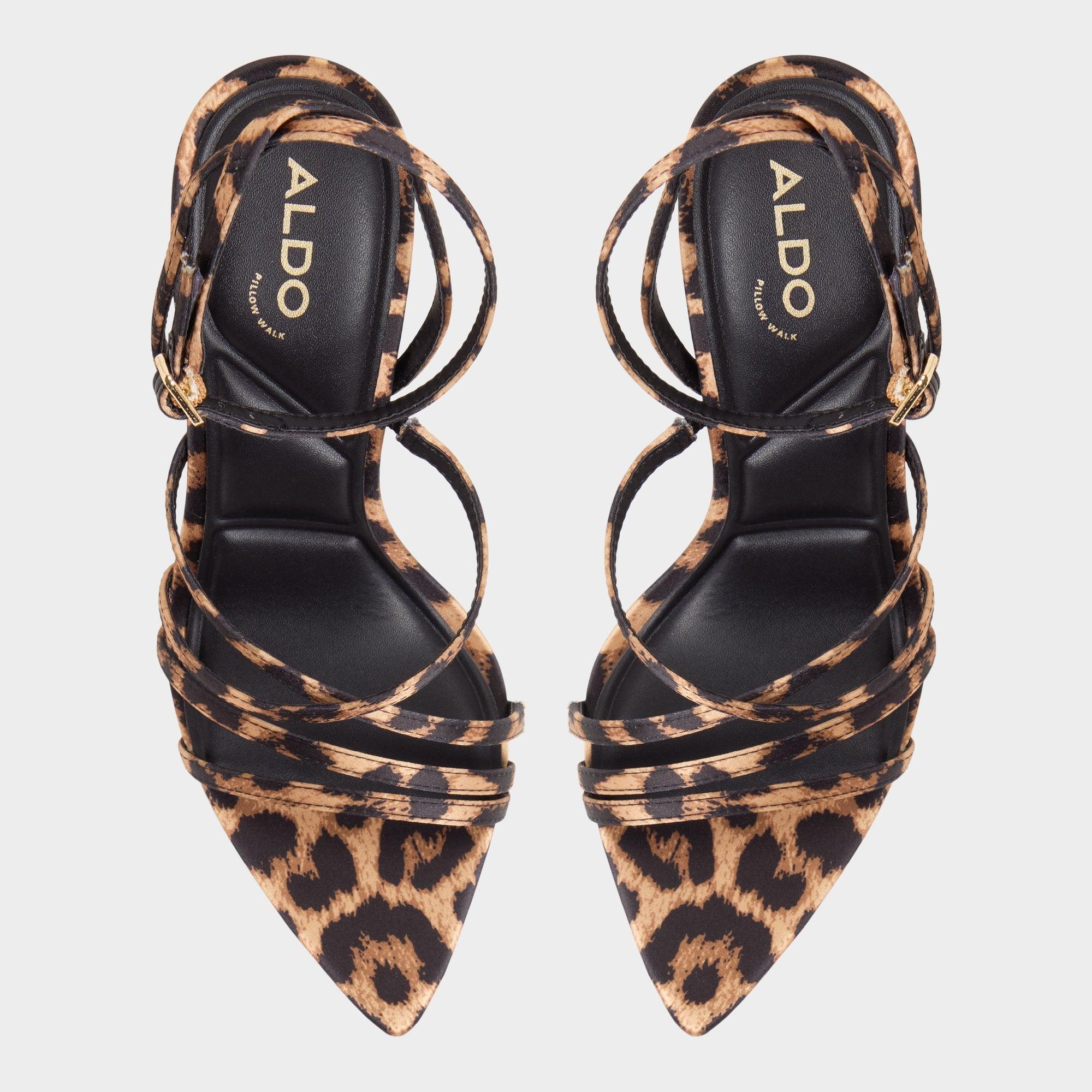 Wild leopard-print straps dance across a square peep toe, balanced by a sharp stiletto and cushioned footbed keeping you steady from photo ops to last song spins. Pair with cropped black denim for drinks or swap in silky slip dresses when weddings mention city views.