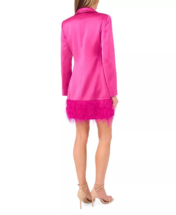 Trimming with elegant feathers, this satin blazer dress from CeCe creates a sophisticated, standout look. A V-neck, long sleeves, and front button closure provide polished style and structure. ABOUT THE BRAND: CeCe is a contemporary lifestyle brand inspired by a romantic take on the everyday, punctuated by taste, wit, and on-the-go flair.
