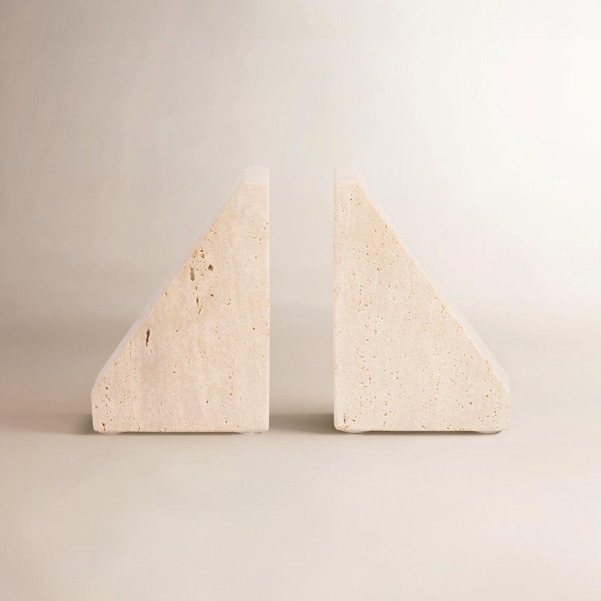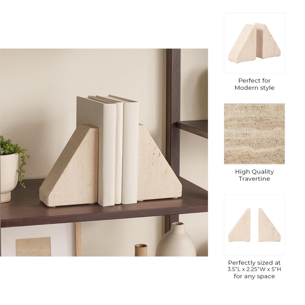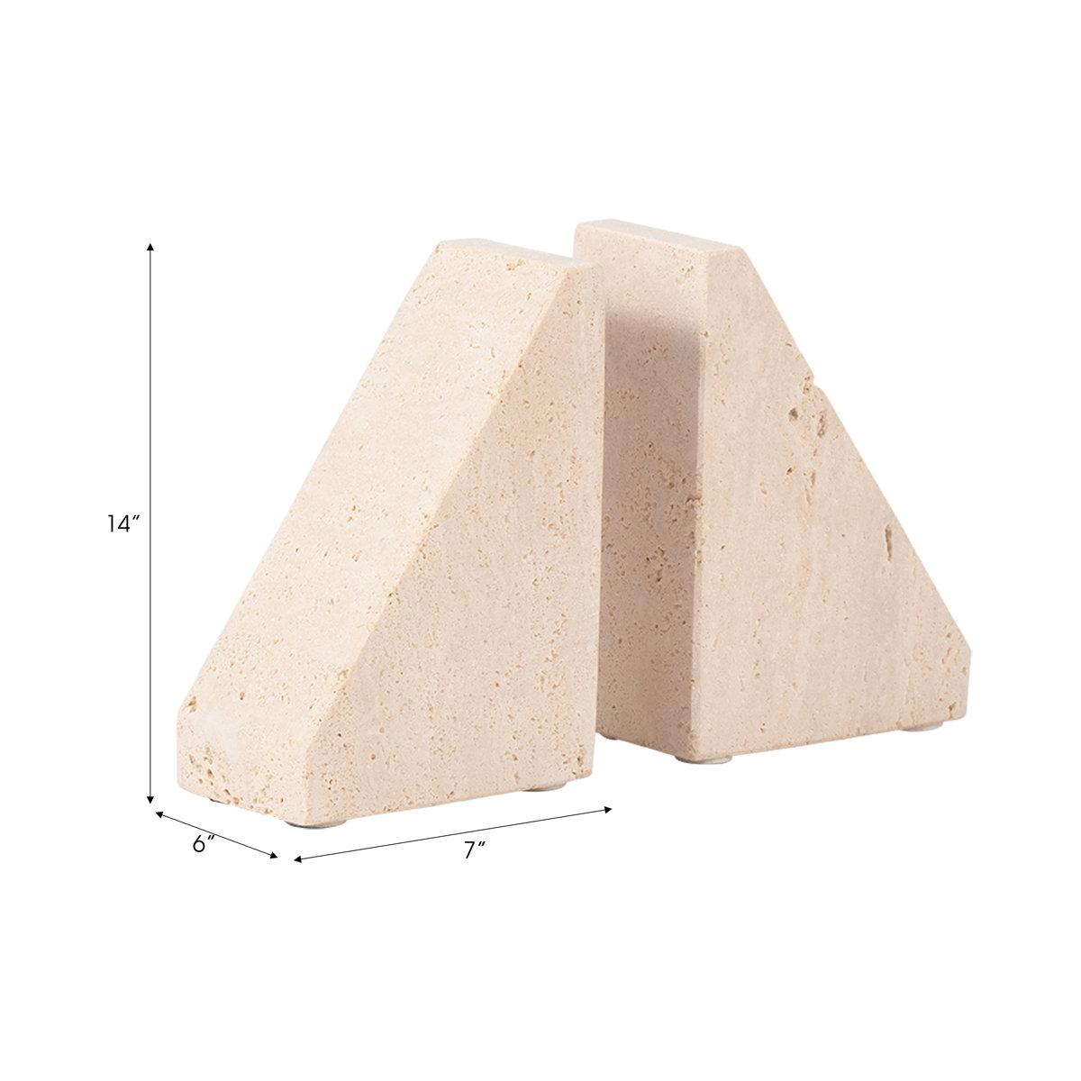 Elegant Travertine Stone Triangle Bookends, Tan Color, Perfect for Home Decor and Organization, Set
