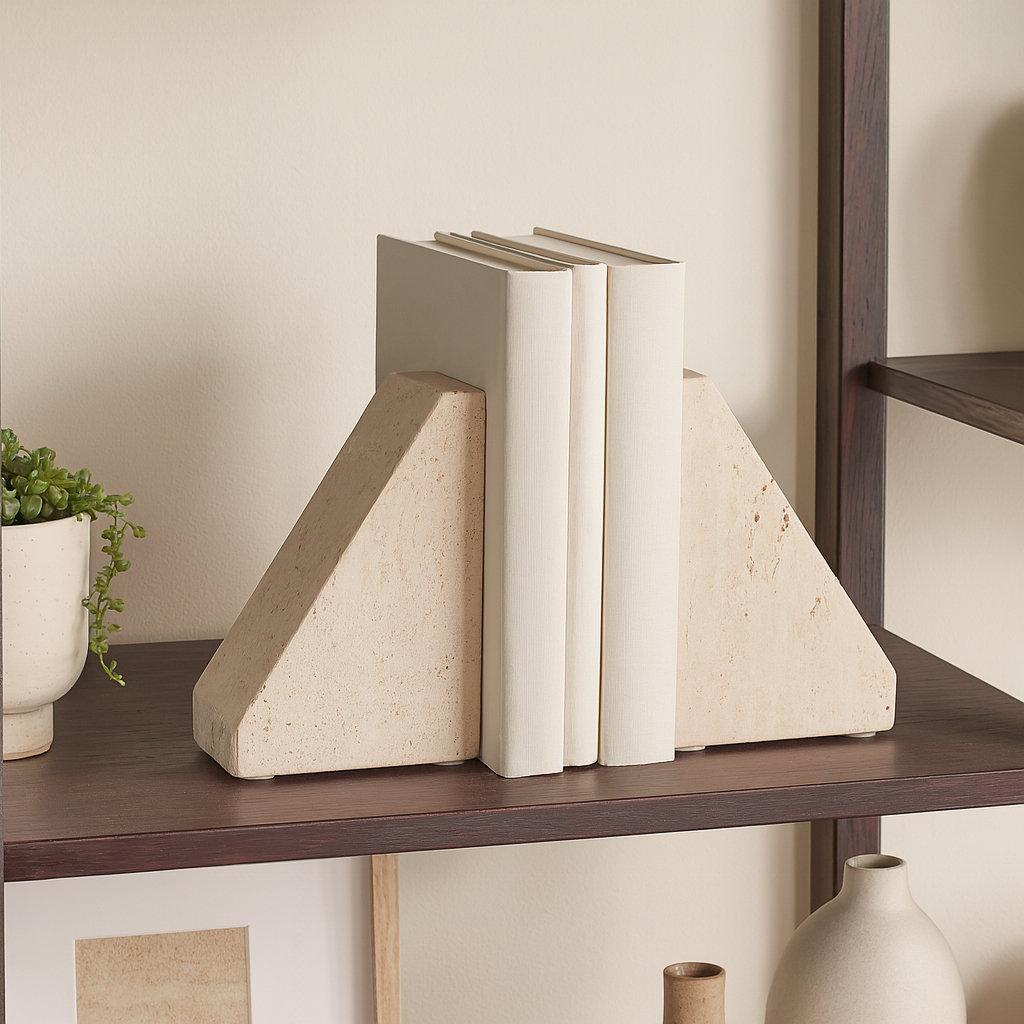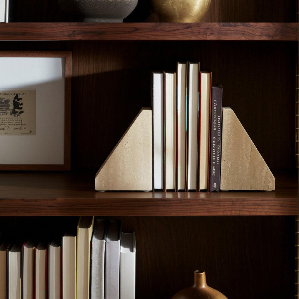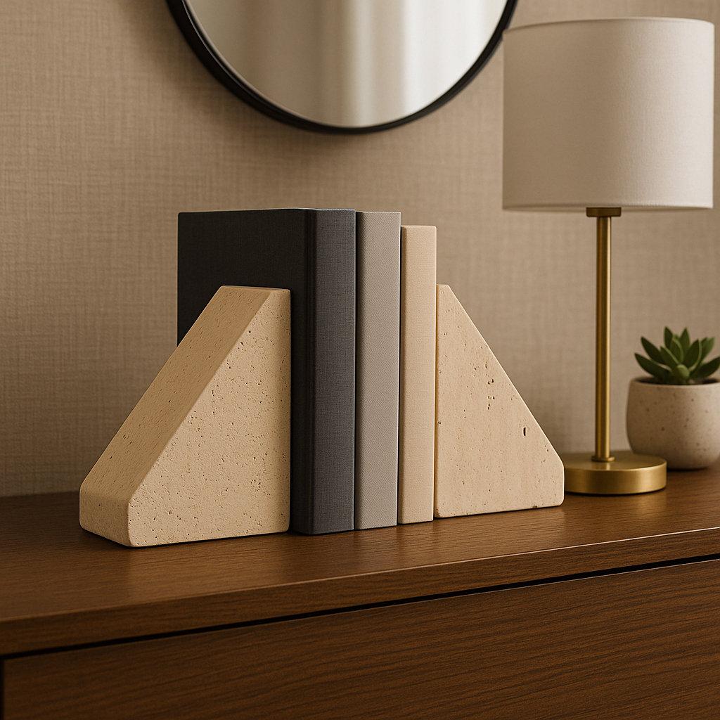 Elegant Travertine Stone Triangle Bookends, Tan Color, Perfect for Home Decor and Organization, Set